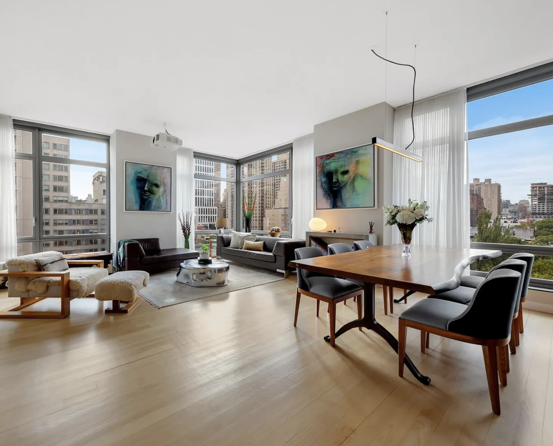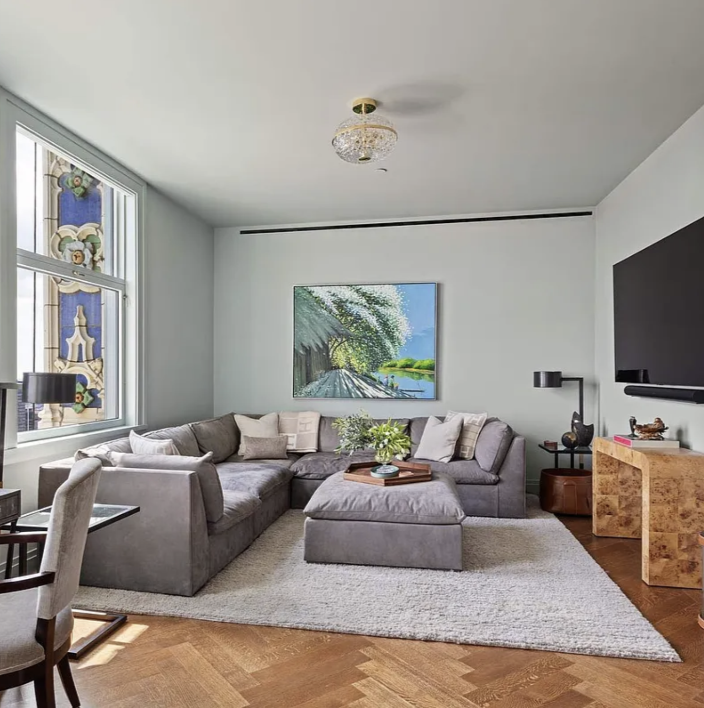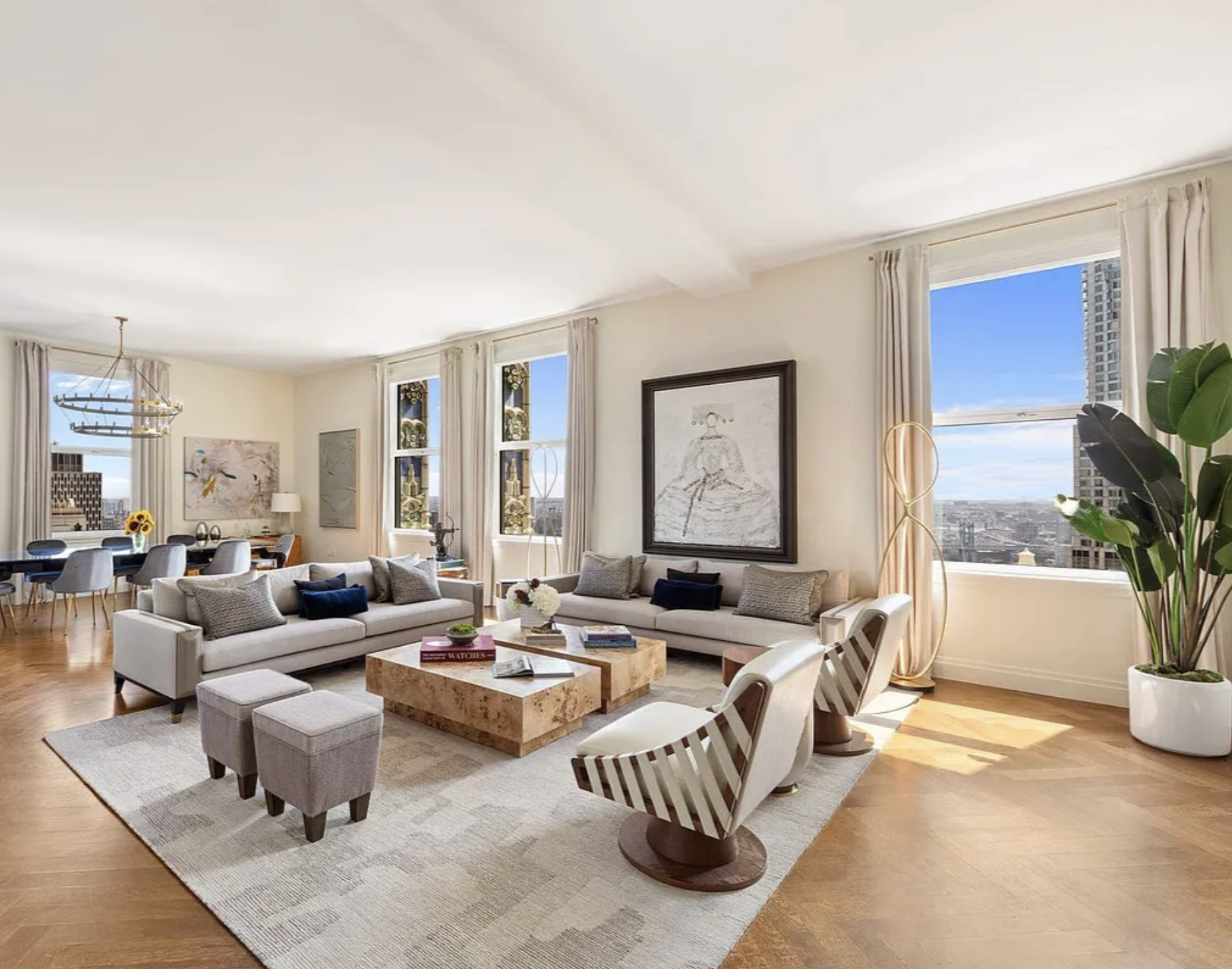 Reimagined by architect Thierry Despont, the residence blends prewar grandeur with modern finishes, featuring an elegant eat-in chef’s kitchen with Calacatta marble and Miele appliances, a serene corner primary suite with spa bath and steam shower, and three exposures through oversized windows that flood the home with natural light.