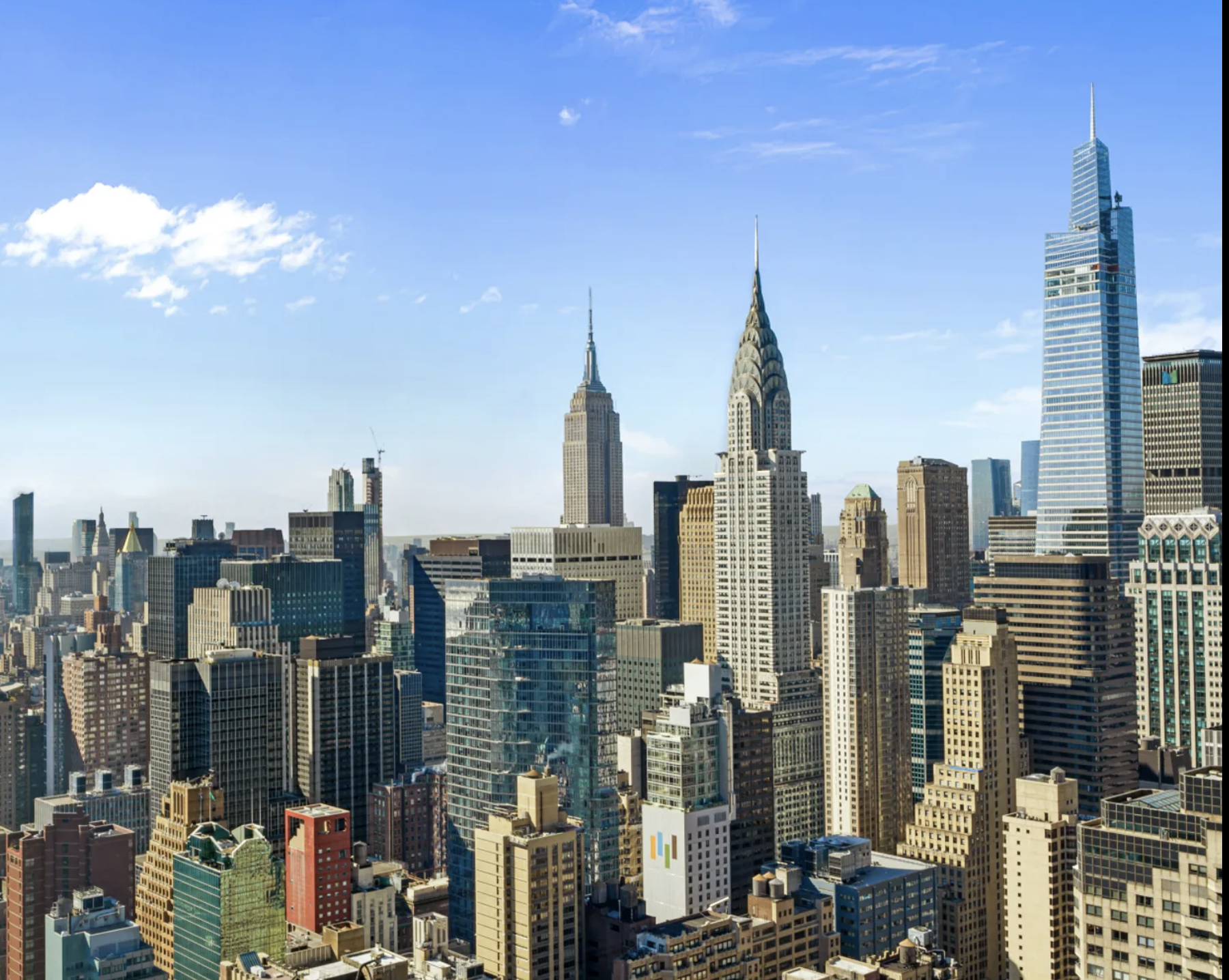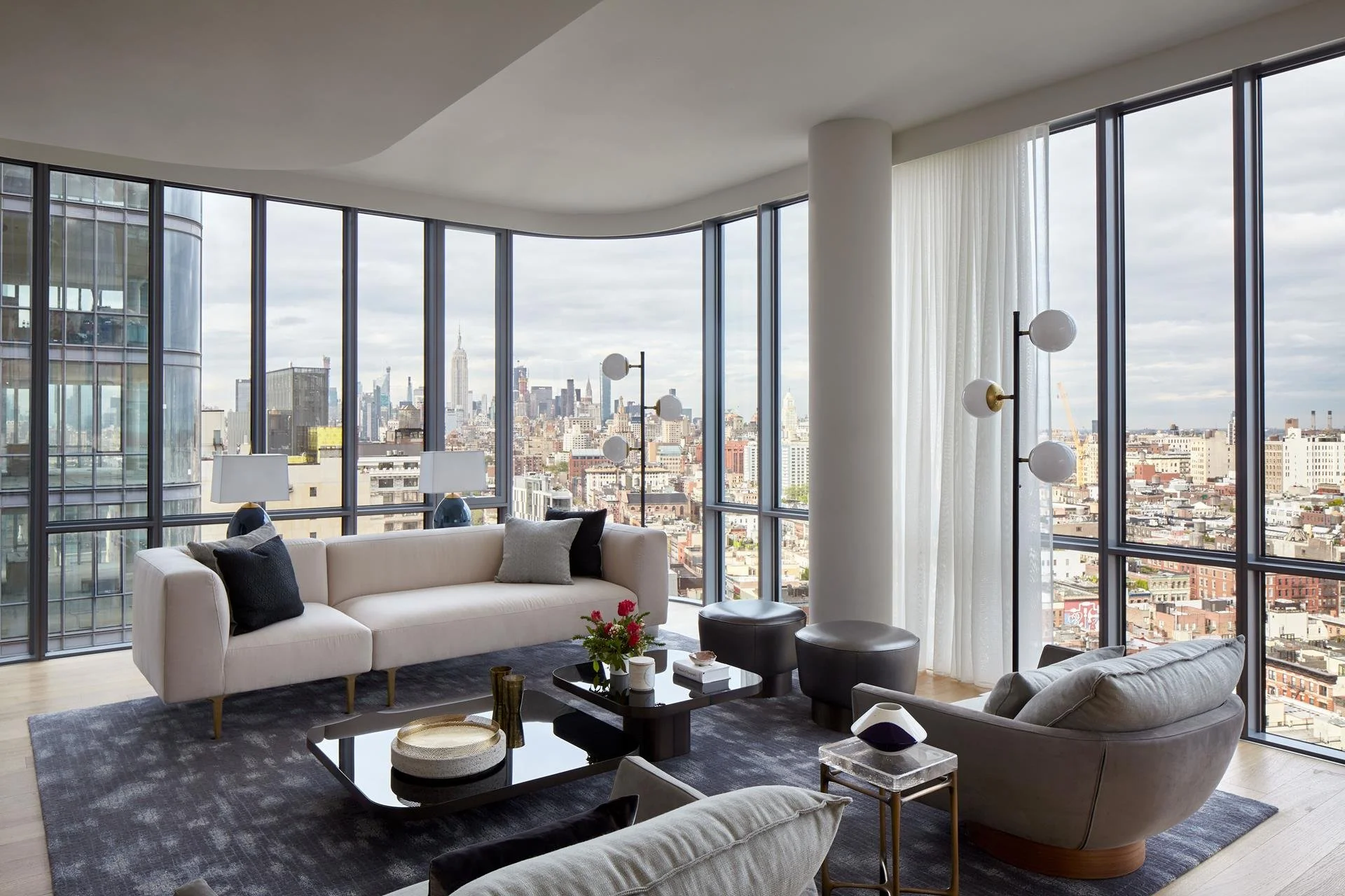 This expansive 2,399 sq ft corner residence at 565 Broome SoHo offers 3 bedrooms, 3.5 bathrooms, 10-foot ceilings, wide-plank white oak floors, and sweeping north and east skyline views of Midtown and historic SoHo. A private keyed elevator opens to a sun-filled great room and a sleek open kitchen with custom white oak cabinetry, Balsatina lava stone countertops, and premium Miele appliances.