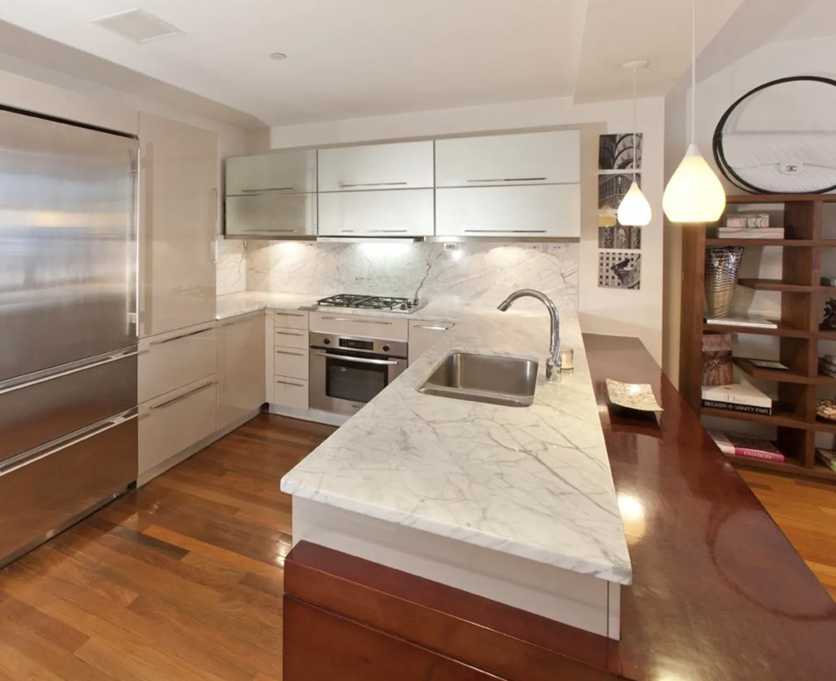 Best-priced two-bedroom in Chelsea at 163 West 18th Street, 3A. This oversized split 2BR residence at the sought-after Slate Condominium features dual private terraces, south-facing floor-to-ceiling windows, and rich Brazilian walnut hardwood floors throughout. The chef’s kitchen is outfitted with Sub-Zero and Bosch appliances, Carrara marble countertops, custom glass and lacquer cabinetry, and a cherry wood breakfast bar.