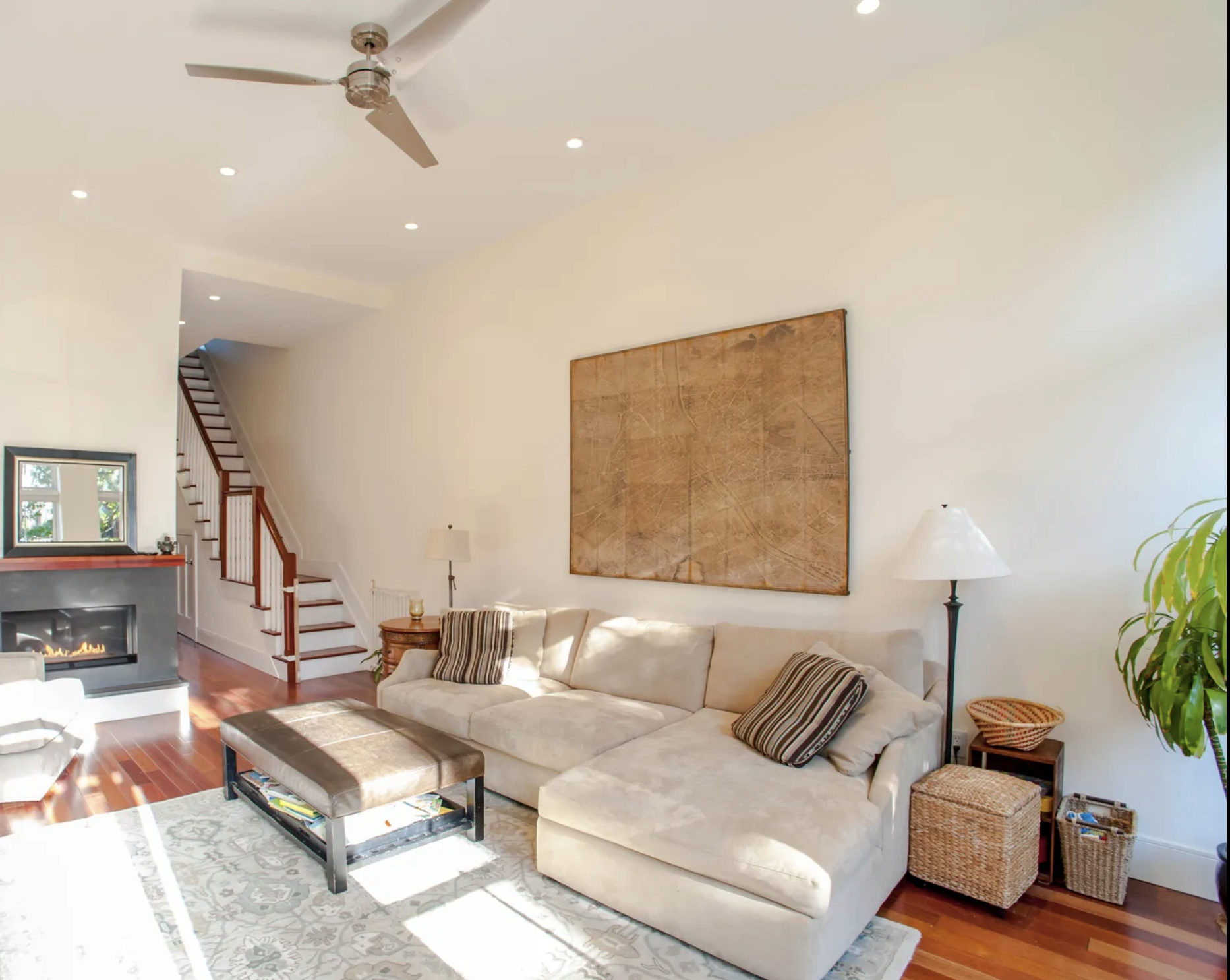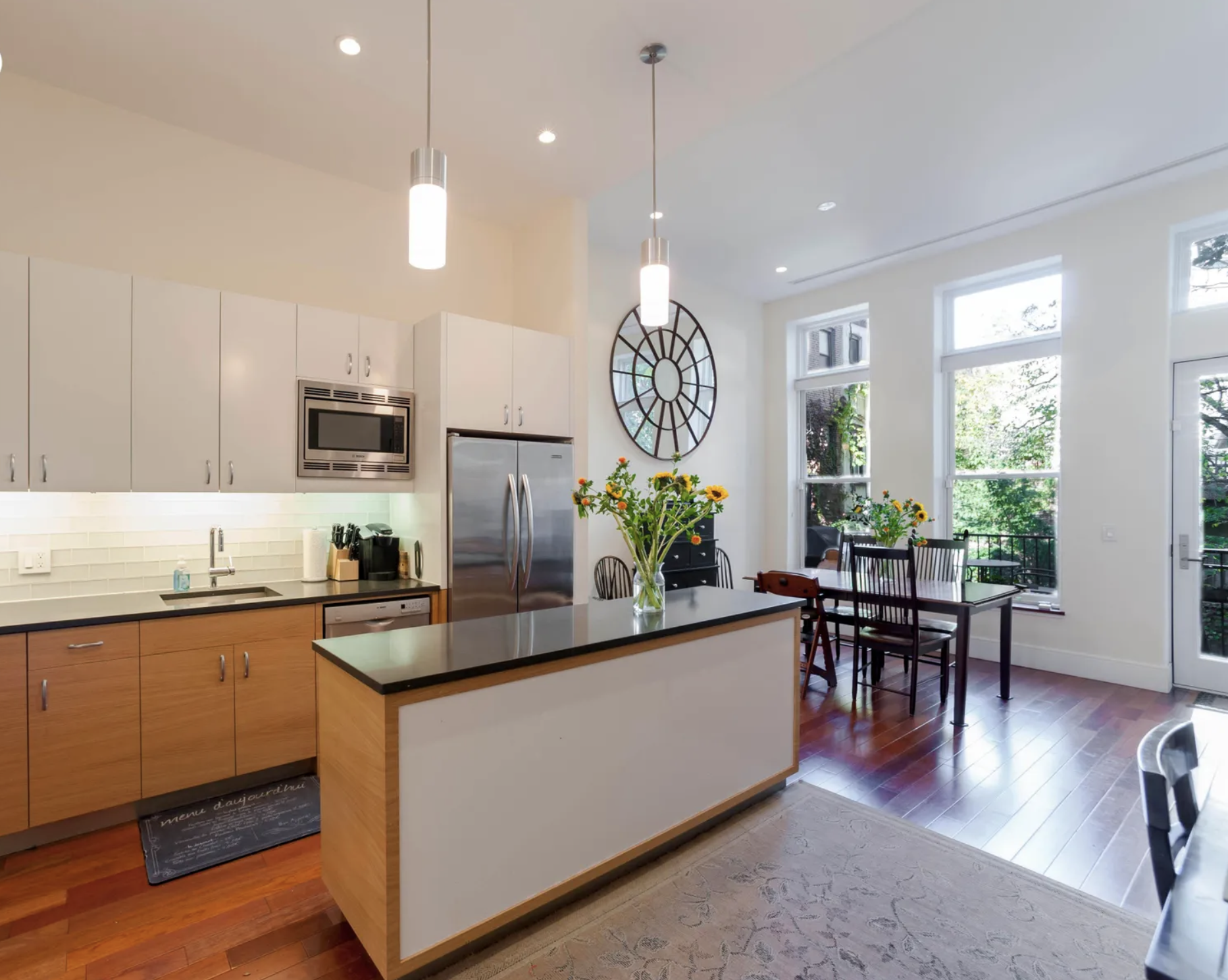 The award-winning two-family residence features a sun-filled owner’s triplex-plus layout with soaring ceilings, floor-to-ceiling windows, a chef’s kitchen, and a luxurious primary suite with radiant-heated bath and walk-in closets.