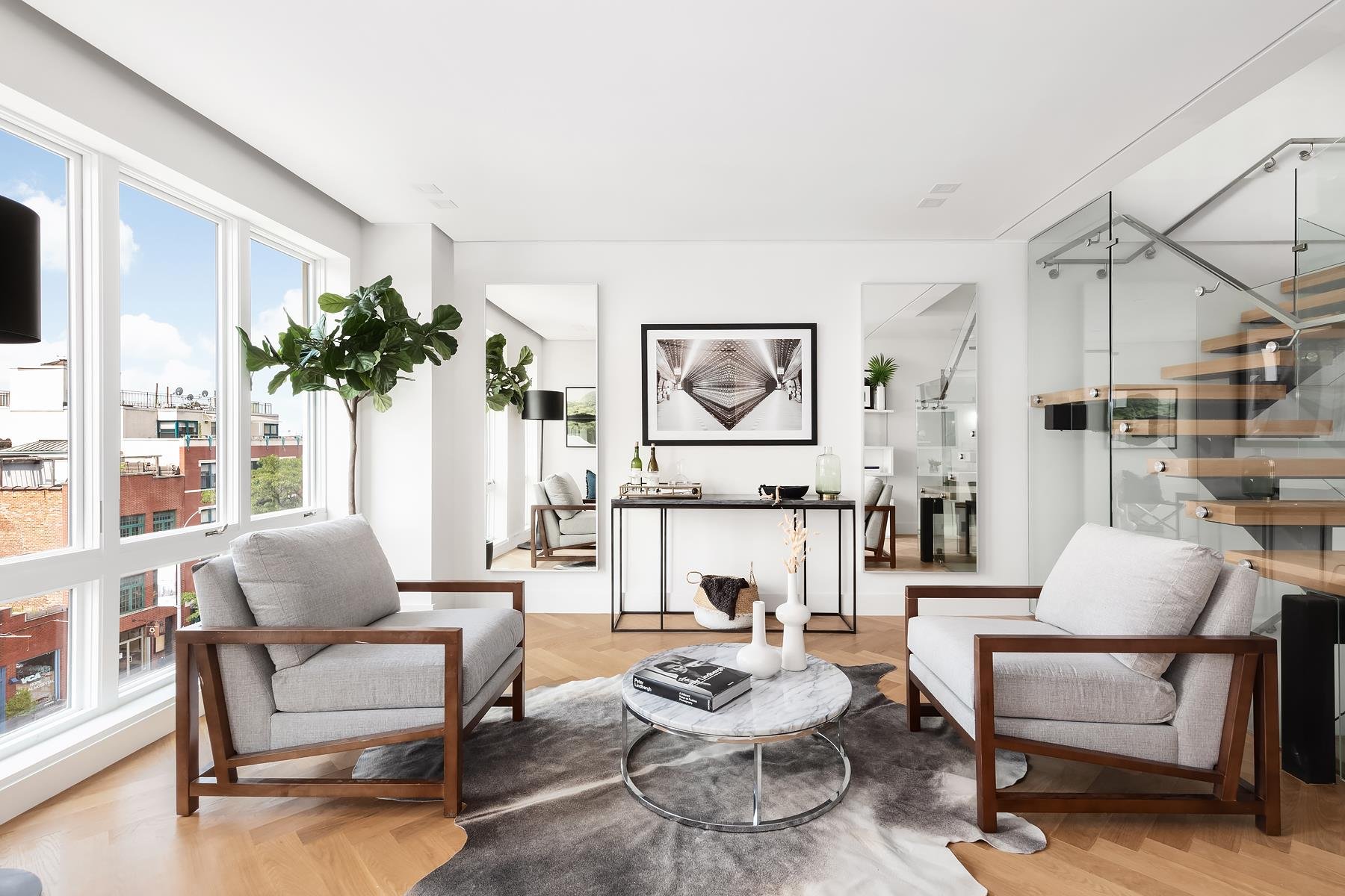 This contemporary duplex penthouse overlooking Madison Square Park offers dramatic scale, exceptional light, and sweeping East and West River skyline views from nearly every room. The expansive main living area features extra high ceilings and oversized windows, complemented by a sleek Boffi SoHo kitchen with premium Miele and Sub Zero appliances.