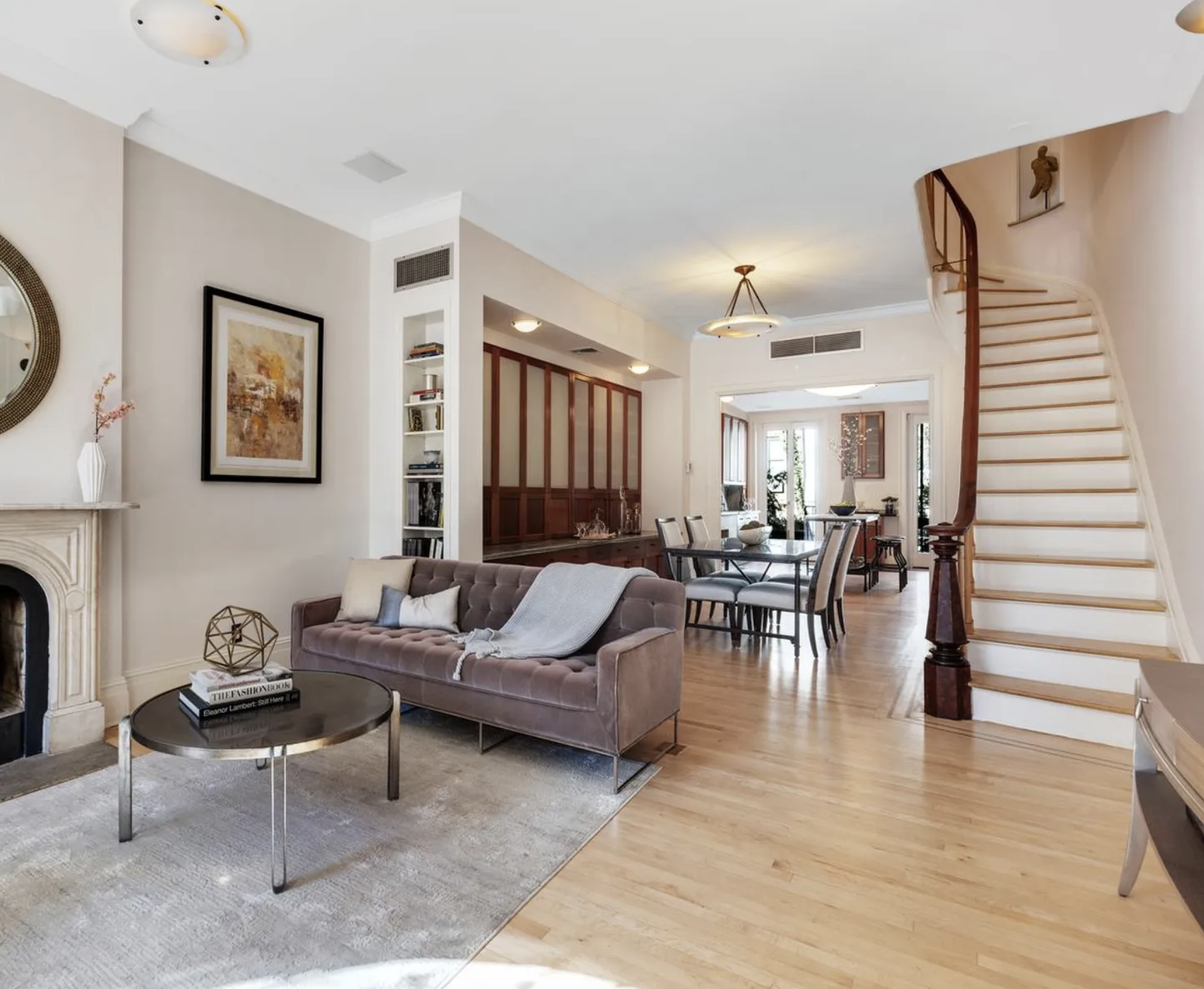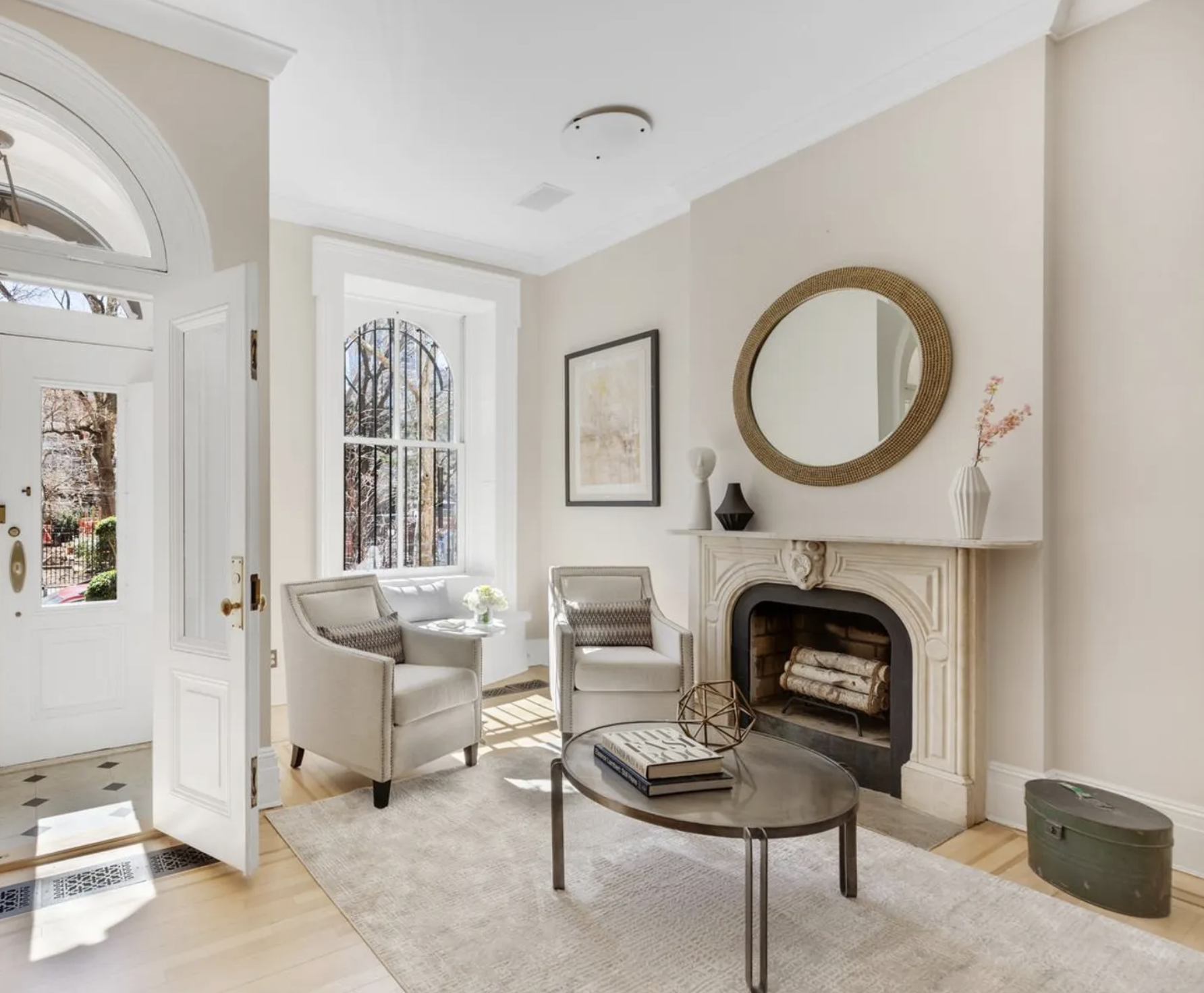Built in 1856, the residence blends timeless architectural character with thoughtful modern updates across six bedrooms and five and a half bathrooms, featuring nine original wood burning fireplaces, soaring ceilings, maple floors with walnut inlays, and a grand staircase. The parlor level offers elegant entertaining spaces filled with southern light, while the kitchen opens to a bluestone terrace overlooking a landscaped garden and pergola.